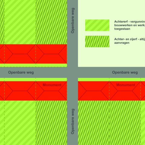 Is het hoofdgebouw op uw perceel bijvoorbeeld niet aangewezen als monument, dan kunt u vergunningvrij bouwwerkzaamheden verrichten. Voorwaarde daarbij is dat uw erf of perceel waarop u de werkzaamheden verricht niet is gericht richting openbaar toegankelijk gebied. Een zij-erf achter de achtergevel is dus wel vergunningplichtig, maar een achtererf ingesloten binnen bouwblokken dus niet.